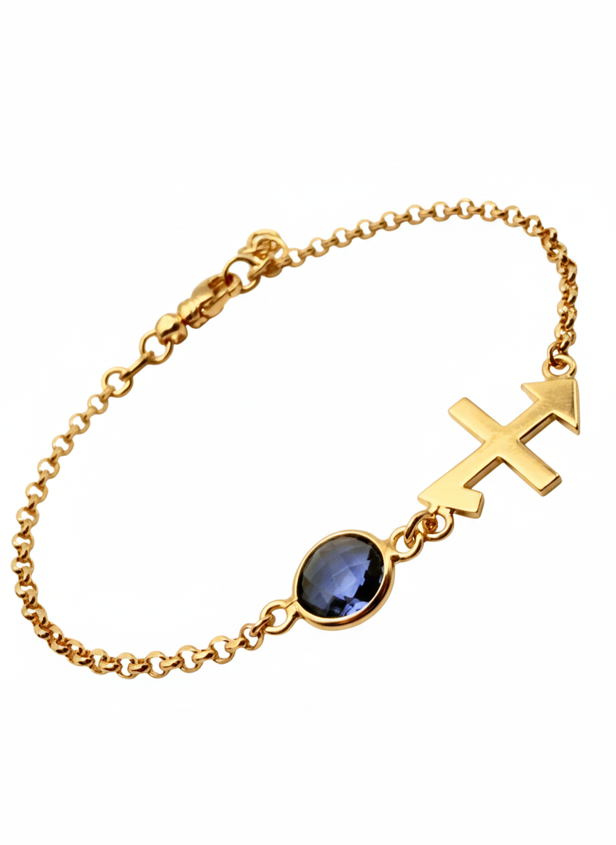 Bracciale Sagittario in argento 925 placcato oro, realizzato artigianalmente con catena forzata e chiusura a moschettone.