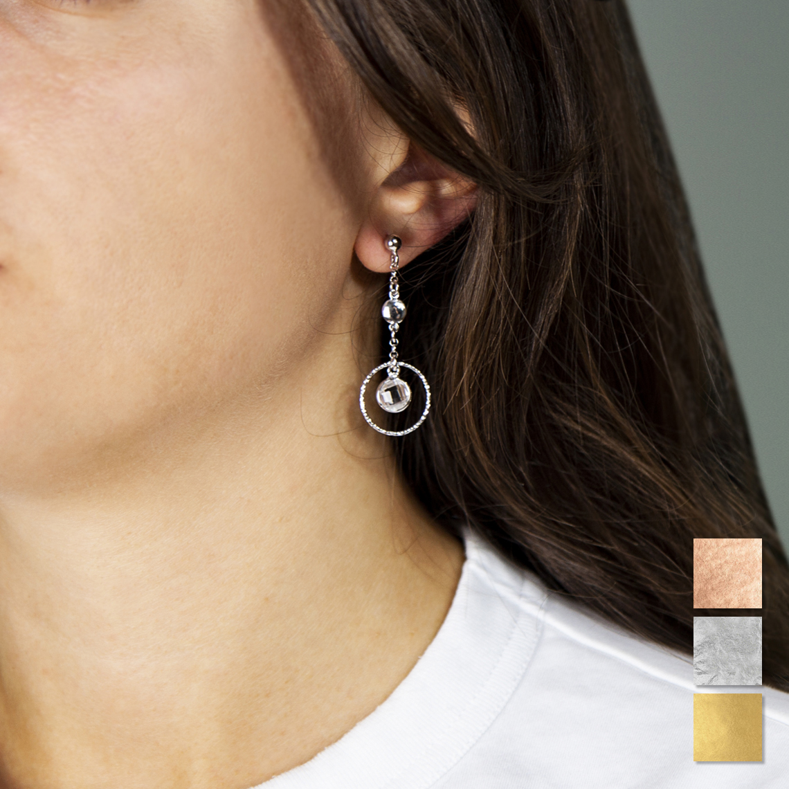 Orecchini da donna in argento 925 rodiato con Cristallo di Rocca naturale taglio tondo briolè (8mm) con inserti godronati e iserti lenticolari tondi lucidati a specchio.