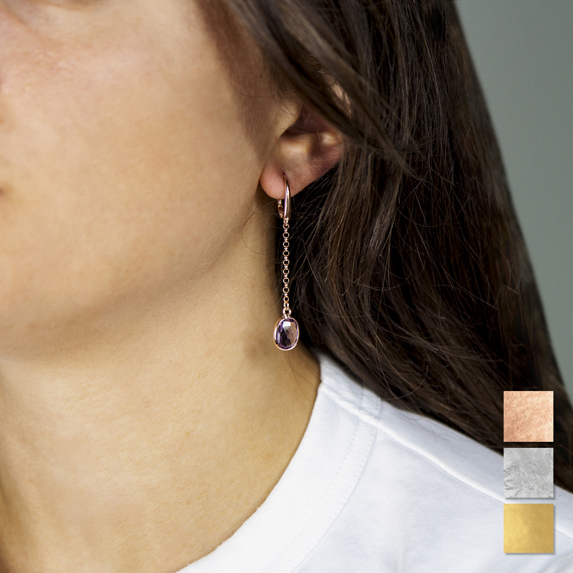 Orecchini da donna in argento 925 placcato oro rosè con ametista idrotermale taglio ovale briolè (10x8mm).